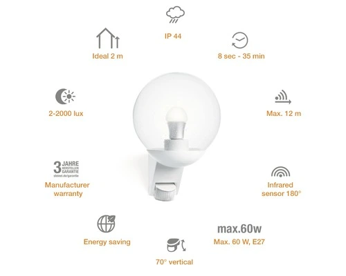 Het is al donker als u thuis komt. Het licht bij de deur schakelt automatisch aan, wijst u de weg en u vindt uw slot direct. De techniek is intelligent geworden. Daarvoor zorgt de nieuwe sensortechnologie in de lamp, die het licht alleen inschakelt wanneer het werkelijk nodig is. Hierbij herkent de ingebouwde sensor of er iemand in het registratiegebied is en schakelt de lamp vervolgens automatisch in. Dankzij de fraai gevormde voet kunt u hem ook als moderne lamp gebruiken. Zodat uw tuin betrouwbaar – en energiezuinig – gelijkmatig en sfeervol wordt verlicht. Iedere nacht weer.